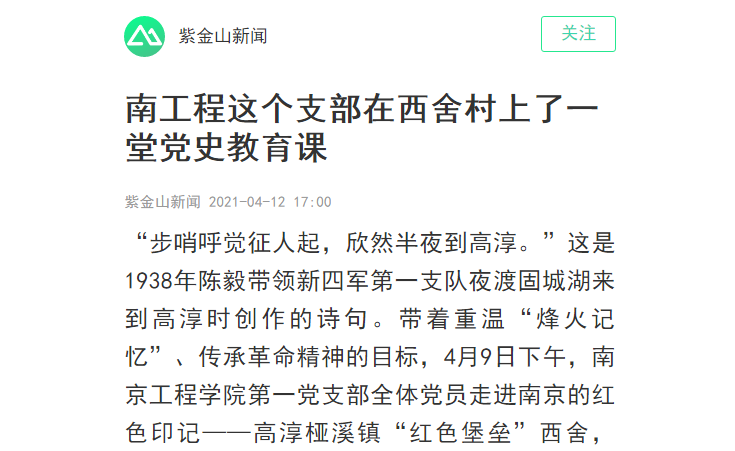 溧高县国华初级中学旧址里,在聆听了高淳区新四军研究会常务理事陈宁剑关于苏南溧高抗战史的介绍之后,党委书记史国君为党员们现场上了一堂微党课。他说,新四军铁军精神是孕育于江苏大地的江苏四种革命精神之一,走进西舍村,随处可见红色主题绘画和饱含正能量的红色宣传语,让我们感受到的是‘红色情怀、红色西舍’,生动的苏南溧高抗战史介绍,让我们体会到了那段峥嵘岁月里新四军的优良革命传统。红色资源就在身边,浸润其间,会让人产生强烈的历史现场感,给人带来更大的触动,引发更深入的思考。“机关一支部的现场学习在学校打了头阵”,史书记希望党员师生能结合党史教育,走进身边的第一“教学现场”接受党性洗礼,让一处处革命旧址成为党史学习丰富生动的教科书,让一个个红色故事,成为淬炼党员干部初心使命最好的营养剂。