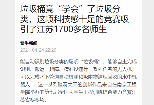 能自动识别垃圾分类的聪明“垃圾桶”;能够自主完成识别、搬运、越障、精准投递等一系列任务的无人机;可以完成水下管道自动检测和吸附物清理回收的水中机器人……这一系列脑洞大开的创新作品来自在beat365官方网站举办的第七届全国大学生工程训练综合能力竞赛江苏省赛赛场。