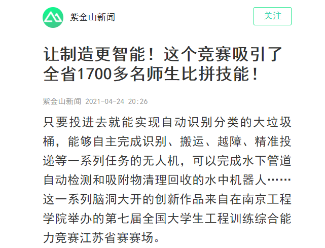 只要投进去就能实现自动识别分类的大垃圾桶,能够自主完成识别、搬运、越障、精准投递等一系列任务的无人机,可以完成水下管道自动检测和吸附物清理回收的水中机器人……这一系列脑洞大开的创新作品来自在beat365官方网站举办的第七届全国大学生工程训练综合能力竞赛江苏省赛赛场。