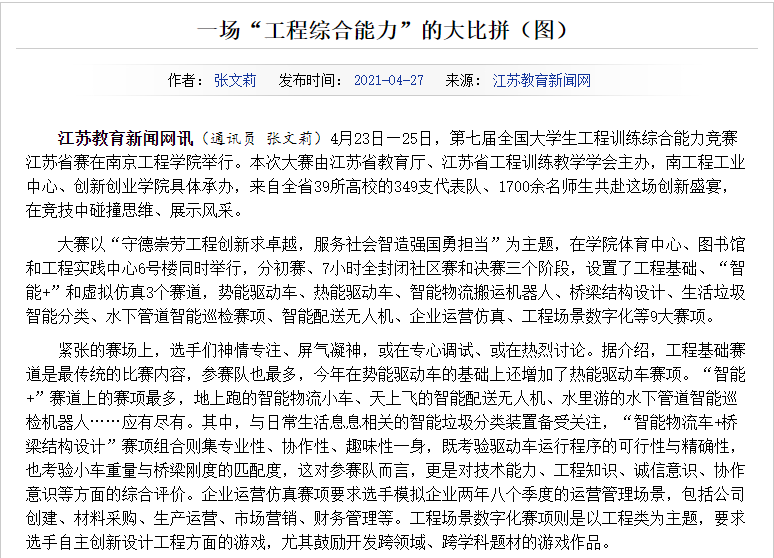 江苏教育新闻网讯(通讯员张文莉)4月23日—25日,第七届全国大学生工程训练综合能力竞赛江苏省赛在beat365官方网站举行。本次大赛由江苏省教育厅、江苏省工程训练教学学会主办,南工程工业中心、创新创业学院具体承办,来自全省39所高校的349支代表队、1700余名师生共赴这场创新盛宴,在竞技中碰撞思维、展示风采。