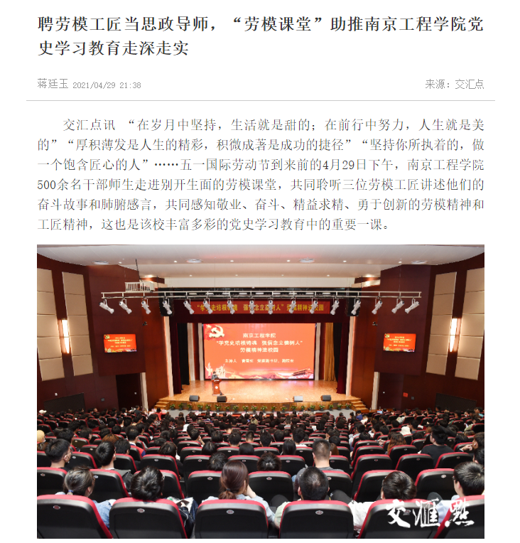 前来为师生们宣讲的三位劳模分别是:南京港机重工制造有限公司技术总监、全国劳动模范沙夕兰,国网江苏省电力有限公司电力科学研究院正高级技师、全国劳动模范、江苏大工匠朱洪斌,国家级技能大师、江苏大工匠、无锡工艺职业技术学院教授张宏文。