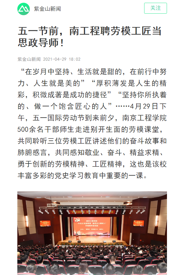 “劳动模范的成功源于勤奋、执着和坚持,他们的事迹是思政课的生动教材,是推动党史教育走深走实的重要举措。该校党委书记史国君说,学校会将劳模课堂持续举办下去,结合大学生思想政治教育,对“劳模精神”“劳动精神”“工匠精神”进行多维度阐释,努力将这些精神元素传承好、发扬好,引导广大师生在平凡的岗位上做出不平凡的业绩,始终做新时代长征路上的不懈奋斗者。