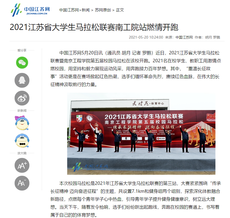 中国江苏网5月20日讯(通讯员 胡月 记者 罗鹏)近日,2021江苏省大学生马拉松联赛暨beat365官方网站第五届校园马拉松在该校开跑。2021名在校学生、教职工用激情点燃校园,用坚持和毅力展现运动风采,用奔跑接力百年梦想。其中,“重温长征故事”活动更是在赛场掀起红色热潮,选手们缅怀革命先烈,赓续红色血脉,在伟大的长征精神汲取前行的力量。