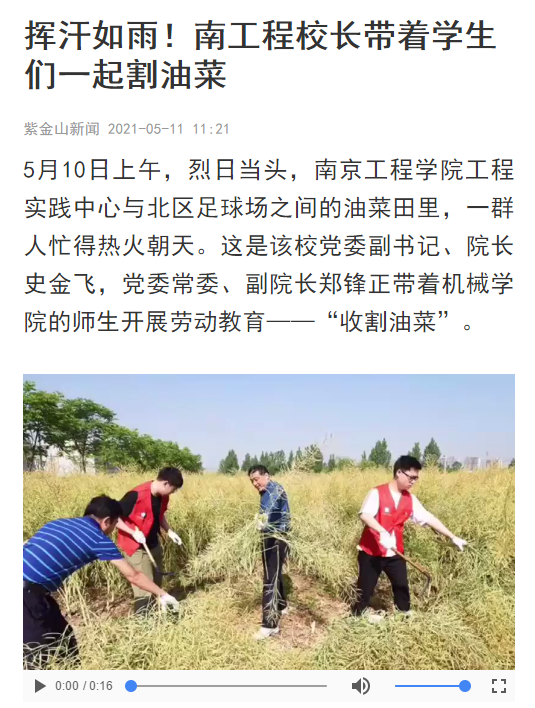 同时兼任机械学院191班第二班主任的史金飞表示,希望同学们通过这次收割油菜的劳动,专心体验劳动的过程和辛劳、用心珍惜劳动的成果和喜悦、细心领悟劳动的光荣和真谛,学会尊重劳动、尊重劳动成果,用辛勤的劳动创造更加美丽的未来。