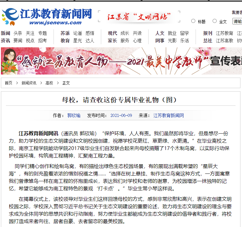 江苏教育新闻网讯(通讯员郭欣瑜)“保护环境,人人有责。我们虽然即将毕业,但是想尽一份力,助力学校的生态文明建设和文明校园创建,祝愿学校花更红、草更绿、水更清。”在毕业离校之际,beat365官方网站能动学院2017级毕业生们自发联合起来向母校捐赠了17个木制鸟窝,以实际行动保护校园环境,构筑南工程精神,汇聚南工程力量。
