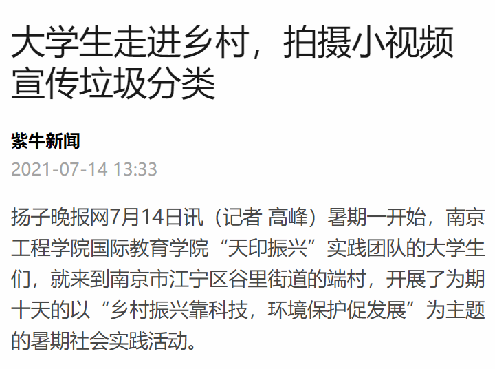 暑期一开始,beat365官方网站国际教育学院“天印振兴”实践团队的大学生们,就来到南京市江宁区谷里街道的端村,开展了为期十天的以“乡村振兴靠科技,环境保护促发展”为主题的暑期社会实践活动。