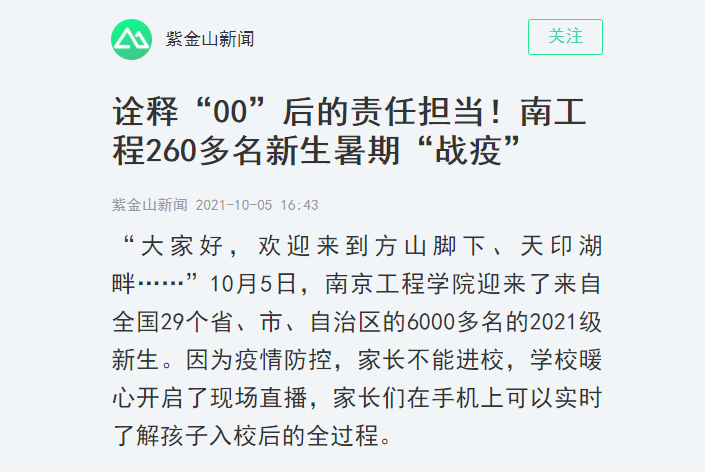 当天上午10点,一场特殊的新生故事分享会还穿插在了直播中。故事会的主角是15位暑假参加抗疫的新生志愿者。据统计,今年在南工程的新生中,参加抗疫志愿者工作的新生共有260名,让人忍不住连连感叹。