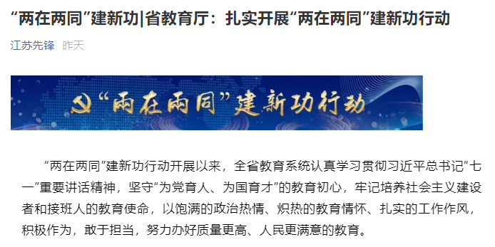 “两在两同”建新功行动开展以来,全省教育系统认真学习贯彻习近平总书记“七一”重要讲话精神,坚守“为党育人、为国育才”的教育初心,牢记培养社会主义建设者和接班人的教育使命,以饱满的政治热情、炽热的教育情怀、扎实的工作作风,积极作为,敢于担当,努力办好质量更高、人民更满意的教育。