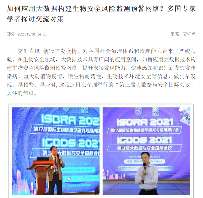 交汇点讯 新冠肺炎疫情,对各国社会治理体系和治理能力带来了严峻考验。在生物安全领域,大数据技术具有广阔的应用空间,如何应用大数据技术构建生物安全风险监测预警网络,提升末端发现能力,快速感知和识别新发突发传染病、重大动植物疫情、微生物耐药性、生物技术环境安全等信息,做到早发现、早预警、早应对,这是近日在深圳举行的“第三届大数据与安全国际会议”关注的焦点。
