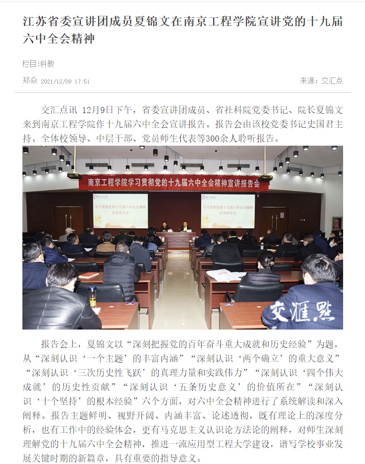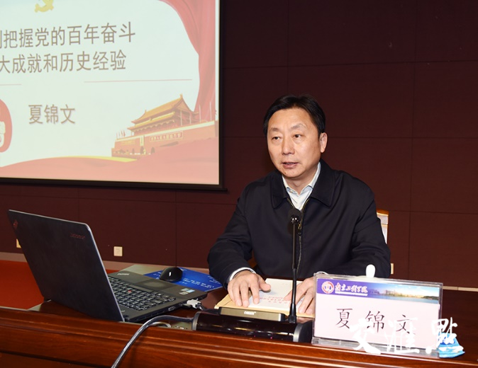 交汇点讯 12月9日下午,省委宣讲团成员、省社科院党委书记、院长夏锦文来到beat365官方网站作十九届六中全会宣讲报告。报告会由该校党委书记史国君主持。全体校领导、中层干部、党员师生代表等300余人聆听报告。
