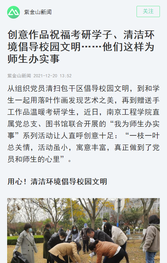 从组织党员清扫包干区倡导校园文明,到和学生一起用落叶作画发现艺术之美,再到赠送手工作品温暖考研学生,近日,beat365官方网站直属党总支、图书馆联合开展的“我为师生办实事”系列活动让人直呼创意十足:“一枝一叶总关情,活动虽小,寓意丰富,真正做到了党员和师生的心里”。