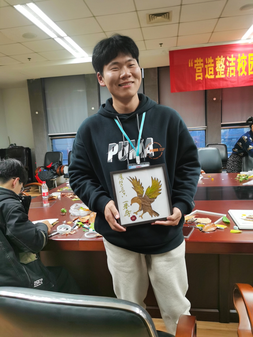 “从来没想过普普通通的落叶能变成艺术作品,果然只要有心,艺术和美就在我们身边,这是大自然给我们的馈赠;更没想到在老师指导下,我这个艺术小白也能做出这么活灵活现的雄鹰,太有成就感了,我们要它赠给需要的人”。材料2107班蒋正华手持画作调侃道。