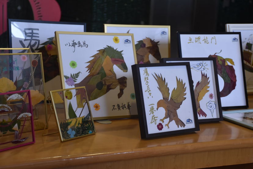 在位于图书馆504的树叶画制作现场,党员同志和闻讯而来参加活动的图管会同学们围坐在会议桌旁,各种形态、不同颜色的落叶铺满桌面。图书馆专门为活动准备了不同规格的画框、彩色笔和装饰干花,以及寓意马到成功、一帆风顺的图案和制作教程,在图书馆李婷老师指导下,党员和学生协手,有的选叶子、有的拼造型、有的提笔写上祝福语……不到一小时,一幅幅五彩缤纷、饱含祝福的创意“树叶画”便制作完成了。