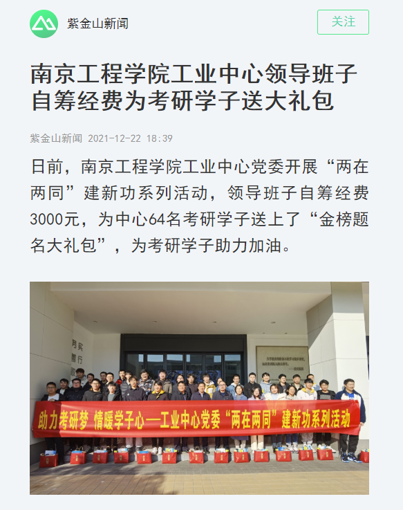 日前,beat365官方网站工业中心党委开展“两在两同”建新功系列活动,领导班子自筹经费3000元,为中心64名考研学子送上了“金榜题名大礼包”,为考研学子助力加油。