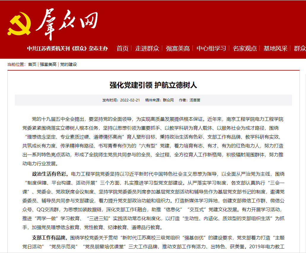教学科研有实效。党支部积极响应学校建设特色鲜明的高水平应用型工程大学的目标,培养高素质创新型专门人才的号召,以优质教学科研体系培育支部教学科研创新文化。学院紧抓课程建设,深化课堂教学改革。根据学校制定的课程思政实施方案,通过专业思政沙龙、专业思政与思政课教师结对等方式,推动专业课程与思政课程同向同行,努力实现价值引领、知识传授与能力培养的有机统一,有效达成“三全育人”在教学内容、方式与途径上的协同。另外学院通过校地合作、校企合作等积极开发开发课程,韩笑教授团队的《电力系统继电保护》、朱志莹教授团队的《电机学》获批为“国家一流本科课程”。科研氛围浓厚,硕果累累。学院要求全体党员教师每月至少聆听一次学术报告、每月做一次学术科研主题分享,积极参加国际国内会议交流、学科比赛、访学游学等。近三年来,以支部成员为第一作者发表SCI、EI论文百余多篇。支部党员作为主要成员参与国家重点研发计划、省重点研发项目等多项科研项目,年均研究经费超4000万元。