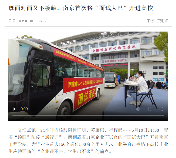 交汇点讯 24小时内核酸阴性证明、苏康码、行程码……5月10日14:30,带着“顶配”防疫“通行证”,两辆载着11家企业面试官的“面试大巴”开进beat365官方网站,为毕业生带去150个岗位500余个用人需求。此举直击疫情下高校毕业生应聘面临的“企业进不去,学生出不来”的痛点。