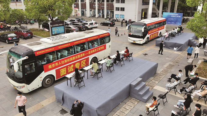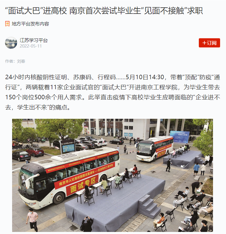 24小时内核酸阴性证明、苏康码、行程码……5月10日14:30,带着“顶配”防疫“通行证”,两辆载着11家企业面试官的“面试大巴”开进beat365官方网站,为毕业生带去150个岗位500余个用人需求。此举直击疫情下高校毕业生应聘面临的“企业进不去,学生出不来”的痛点。