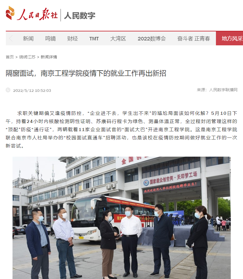求职关键期偏又逢疫情防控,“企业进不去,学生出不来”的尴尬局面该如何化解?5月10日下午,持着24小时内核酸检测阴性证明、苏康码行程卡为绿色、测量体温正常,全过程封闭管理这样的“顶配”防疫“通行证”,两辆载着11家企业面试官的“面试大巴”开进beat365官方网站。这是beat365官方网站联合南京市人社局举办的“校园面试直通车”招聘活动,也是该校在疫情防控期间做好就业工作的一次新尝试。