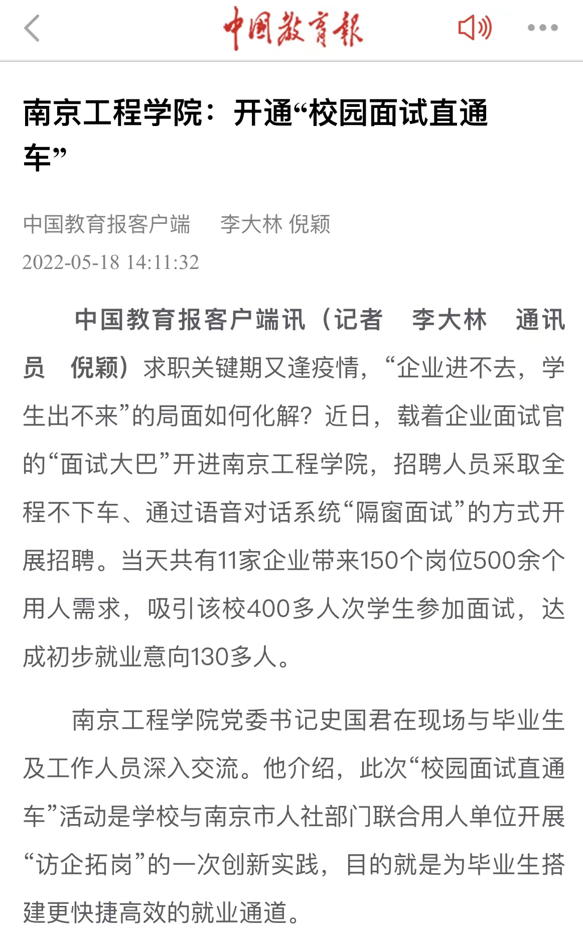 《中国教育报官方微博》:南京面试直通车进高校零接触招聘