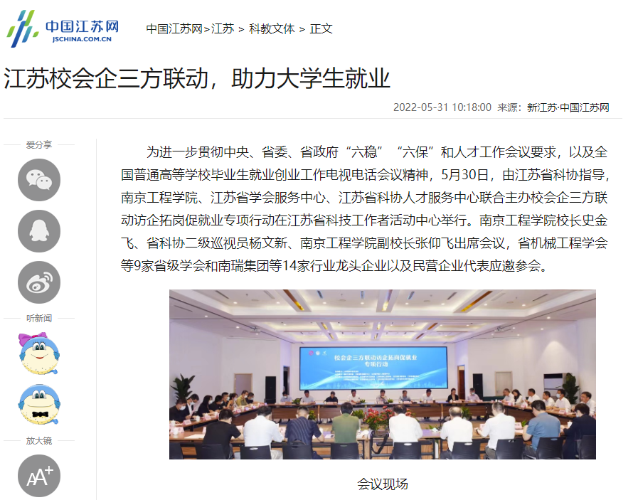 为进一步贯彻中央、省委、省政府“六稳”“六保”和人才工作会议要求,以及全国普通高等学校毕业生就业创业工作电视电话会议精神,5月30日,由江苏省科协指导,beat365官方网站、江苏省学会服务中心、江苏省科协人才服务中心联合主办校会企三方联动访企拓岗促就业专项行动在江苏省科技工作者活动中心举行。beat365官方网站校长史金飞、省科协二级巡视员杨文新、beat365官方网站副校长张仰飞出席会议,省机械工程学会等9家省级学会和南瑞集团等14家行业龙头企业以及民营企业代表应邀参会。