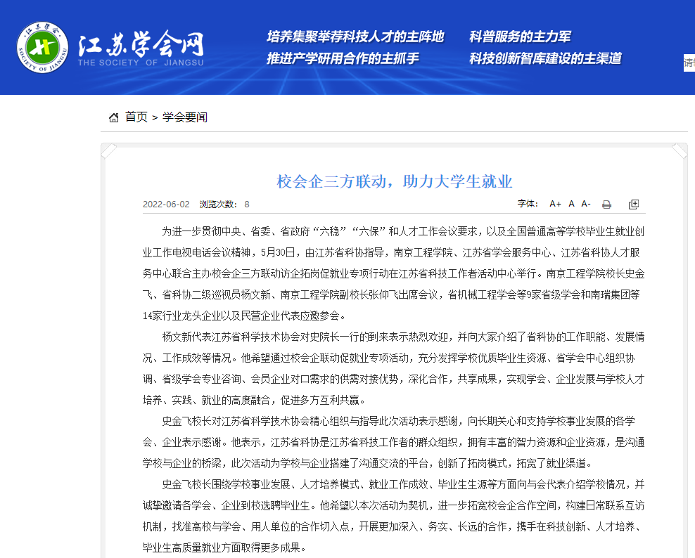 为进一步贯彻中央、省委、省政府“六稳”“六保”和人才工作会议要求,以及全国普通高等学校毕业生就业创业工作电视电话会议精神,5月30日,由江苏省科协指导,beat365官方网站、江苏省学会服务中心、江苏省科协人才服务中心联合主办校会企三方联动访企拓岗促就业专项行动在江苏省科技工作者活动中心举行。beat365官方网站校长史金飞、省科协二级巡视员杨文新、beat365官方网站副校长张仰飞出席会议,省机械工程学会等9家省级学会和南瑞集团等14家行业龙头企业以及民营企业代表应邀参会。