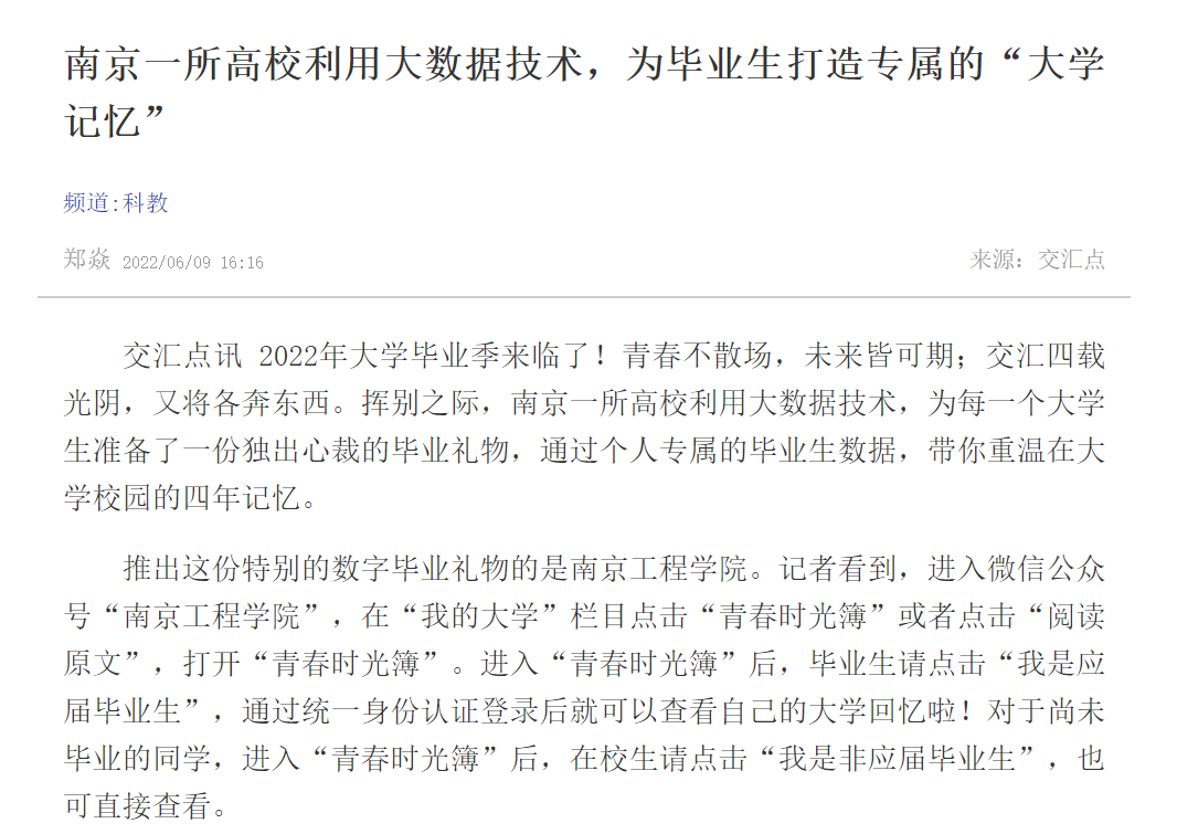 交汇点讯 2022年大学毕业季来临了!青春不散场,未来皆可期;交汇四载光阴,又将各奔东西。挥别之际,南京一所高校利用大数据技术,为每一个大学生准备了一份独出心裁的毕业礼物,通过个人专属的毕业生数据,带你重温在大学校园的四年记忆。