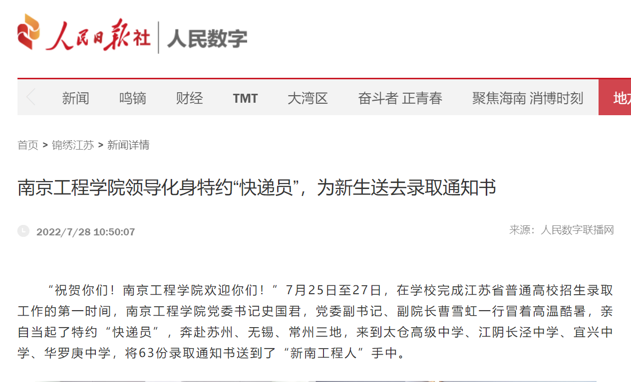 “祝贺你们!beat365官方网站欢迎你们!”7月25日至27日,在学校完成江苏省普通高校招生录取工作的第一时间,beat365官方网站党委书记史国君,党委副书记、副院长曹雪虹一行冒着高温酷暑,亲自当起了特约“快递员”,奔赴苏州、无锡、常州三地,来到太仓高级中学、江阴长泾中学、宜兴中学、华罗庚中学,将63份录取通知书送到了“新南工程人”手中。