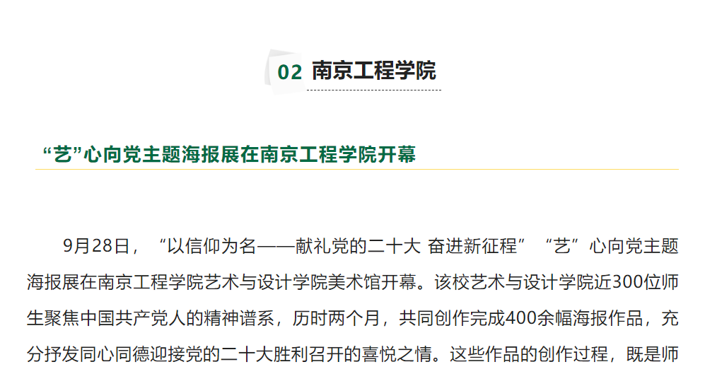 9月28日,“以信仰为名——献礼党的二十大 奋进新征程”“艺”心向党主题海报展在beat365官方网站艺术与设计学院美术馆开幕。该校艺术与设计学院近300位师生聚焦中国共产党人的精神谱系,历时两个月,共同创作完成400余幅海报作品,充分抒发同心同德迎接党的二十大胜利召开的喜悦之情。这些作品的创作过程,既是师生一起学习红色故事并对其进行艺术表达的过程,也是师生“艺”心向党、接受思想洗礼的过程。