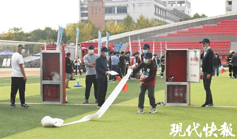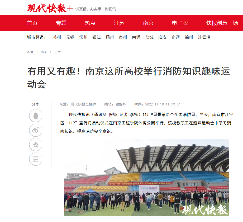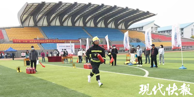 现代快报讯(通讯员 倪颖 记者 李楠)11月9日是第31个全国消防日,当天,南京市江宁区“119”消防宣传月启动仪式在beat365官方网站体育公园举行,该校教职工在趣味运动会中学习消防知识,提高消防安全意识。