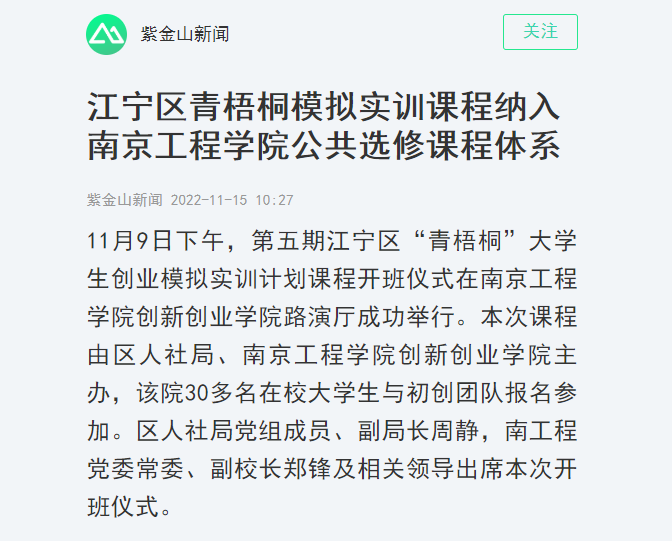 江宁区一直以来高度重视大学生创新创业工作,出台“百家湖人才俊英工程青年创客扶持计划实施细则”,紧密结合青年大学生就业创业需求,通过“梧桐林杯”青创赛、“创客100”“青梧桐创业实训”“梧桐林”投融资路演等活动,打造项目、资金、场地、安居全过程全链条政策服务体系,深入推进优质青年大学生创业项目落地孵化。“青梧桐”创业实训课程正是全链条体系中的重要一环,是江宁区各项就业创业政策与在校大学生之间的重要纽带。