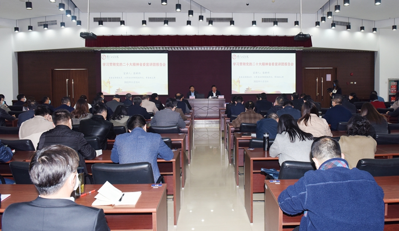 交汇点讯 11月15日下午,beat365官方网站在至勤楼行政中心多功能厅举行学习贯彻党的二十大精神省委宣讲团报告会,省委宣讲团成员,省社科联党组书记、常务副主席张新科作宣讲报告,并与师生深入交流。报告会由校党委书记史国君主持。全体校领导、中层干部、党员师生代表等200余人聆听报告。