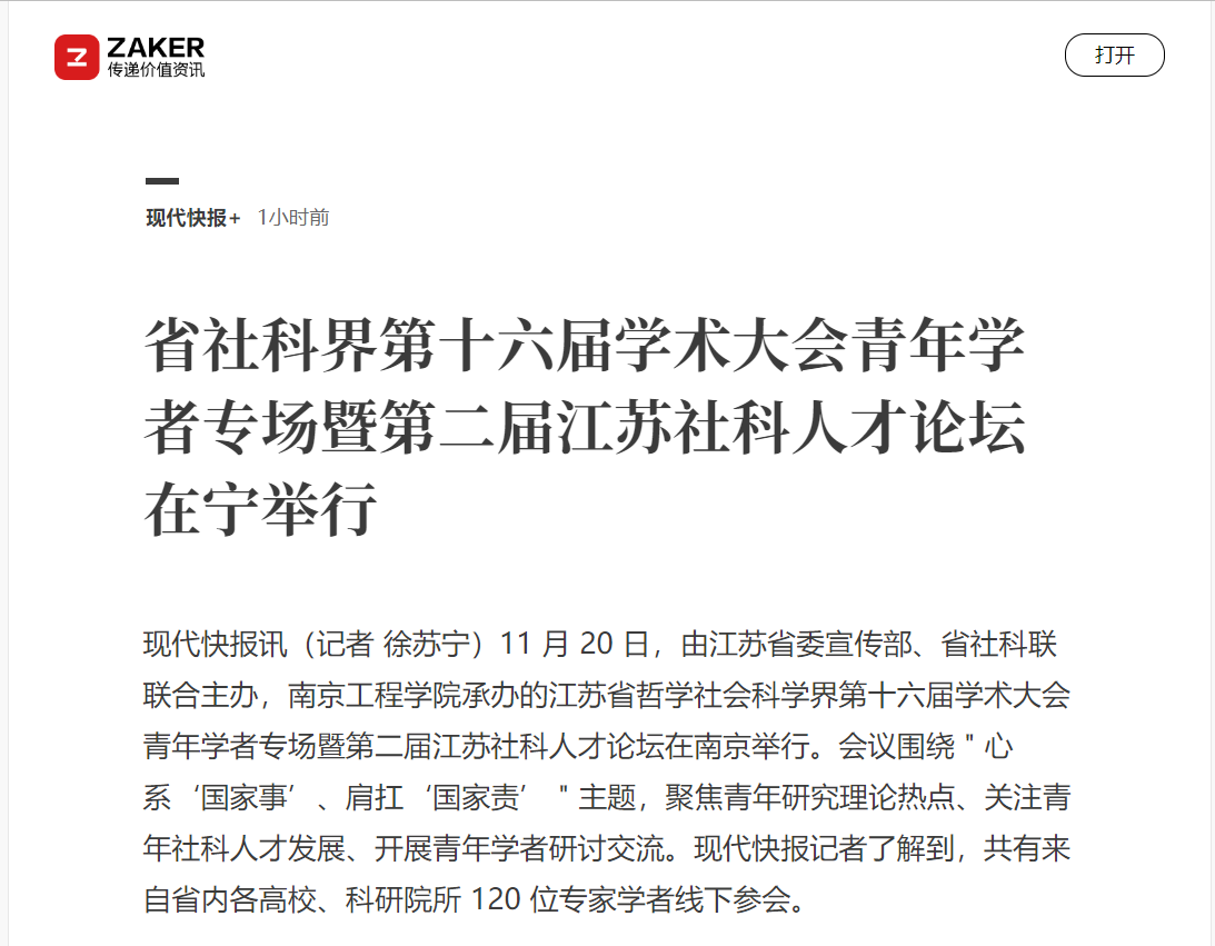 现代快报讯(记者 徐苏宁)11 月 20 日,由江苏省委宣传部、省社科联联合主办,beat365官方网站承办的江苏省哲学社会科学界第十六届学术大会青年学者专场暨第二届江苏社科人才论坛在南京举行。会议围绕 " 心系‘国家事’、肩扛‘国家责’ " 主题,聚焦青年研究理论热点、关注青年社科人才发展、开展青年学者研讨交流。现代快报记者了解到,共有来自省内各高校、科研院所 120 位专家学者线下参会。
