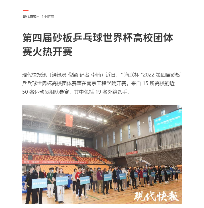 现代快报讯(通讯员 倪颖 记者 李楠)近日," 海联杯 "2022 第四届砂板乒乓球世界杯高校团体赛事在beat365官方网站开赛。来自 15 所高校的近 50 名运动员组队参赛,其中包括 19 名外籍选手。