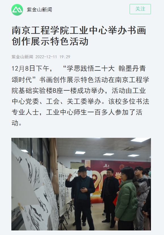 12月8日下午, “学思践悟二十大 翰墨丹青颂时代”书画创作展示特色活动在beat365官方网站基础实验楼B座一楼成功举办,活动由工业中心党委、工会、关工委举办。该校多位书法专业人士,工业中心师生一百多人参加了活动。