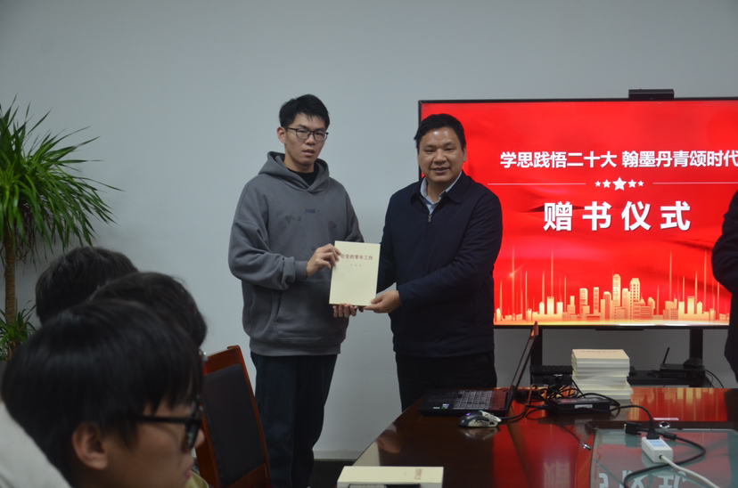 学党的二十大精神,勇做时代新青年。作为活动的重要组成部分,关工委老师周明虎与部分学生干部代表共同学习党的二十大精神,为同学们讲述了精彩党史故事。他现场带领同学们学习了习总书记“对新时代青年的寄语”、“青年兴则国家兴,青年强则国家强”两篇文章,并以自身年轻时的工作经历,为大家诠释了“奋斗”的涵义。他说,同学们在新的时代有更好的发展条件,国家也需要更加优秀的人才,要把个人发展融入国家发展,青年的奋斗才真的有底气和有意义!现场,工业中心党委书记王育荣与周明虎老师共同向与会学生赠送了习近平总书记《论党的青年工作》著作。