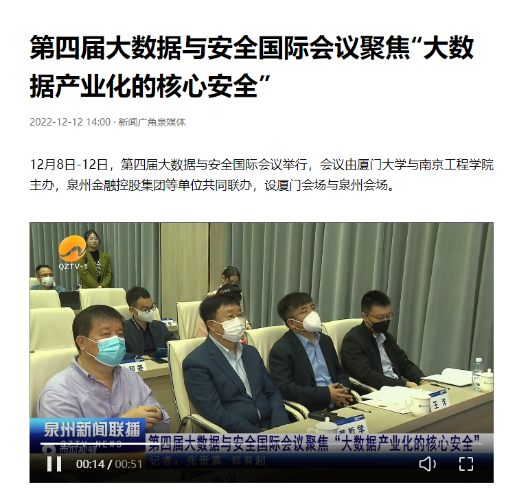 12月8日-12日,第四届大数据与安全国际会议举行,会议由厦门大学与beat365官方网站主办,泉州金融控股集团等单位共同联办,设厦门会场与泉州会场。