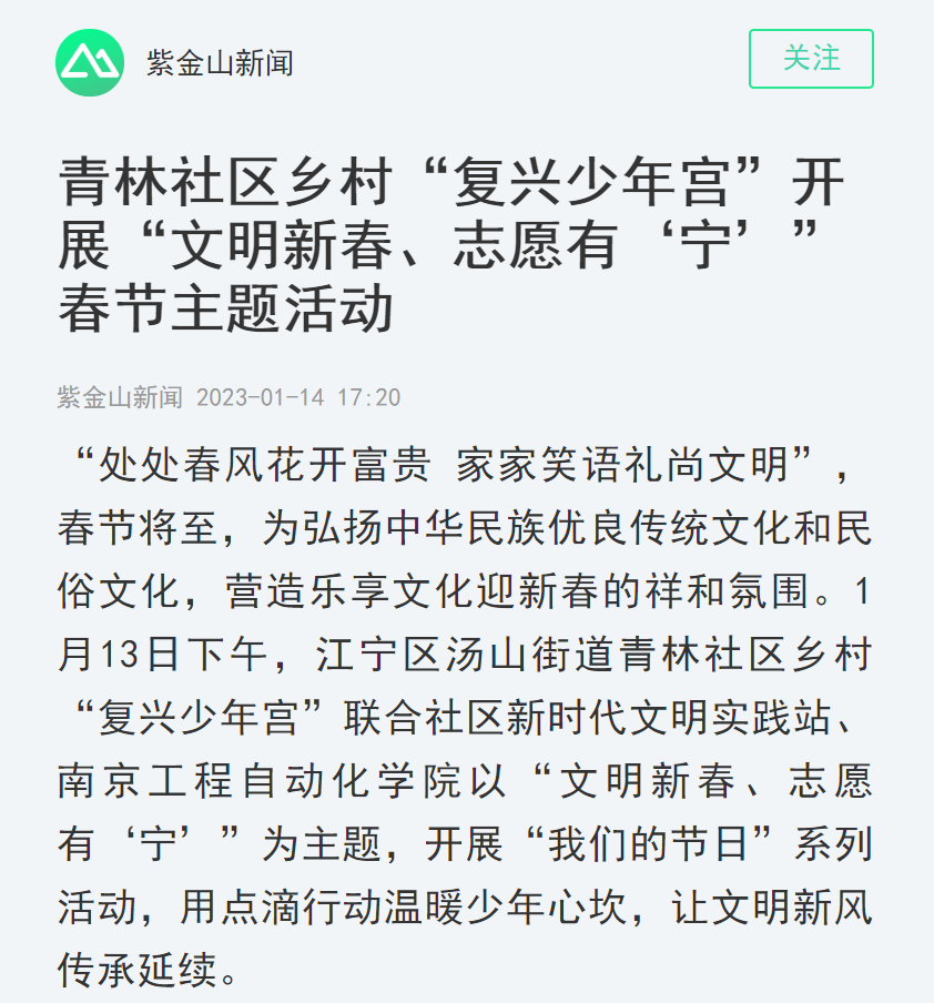 “处处春风花开富贵家家笑语礼尚文明”,春节将至,为弘扬中华民族优良传统文化和民俗文化,营造乐享文化迎新春的祥和氛围。1月13日下午,江宁区汤山街道青林社区乡村“复兴少年宫”联合社区新时代文明实践站、南京工程自动化学院以“文明新春、志愿有‘宁’”为主题,开展“我们的节日”系列活动,用点滴行动温暖少年心坎,让文明新风传承延续。