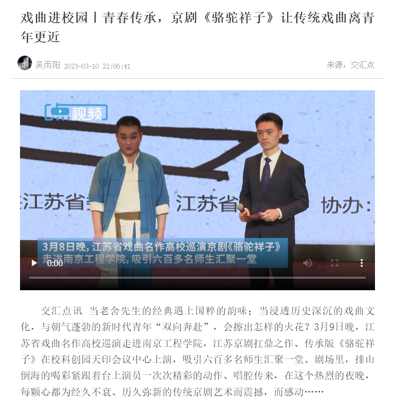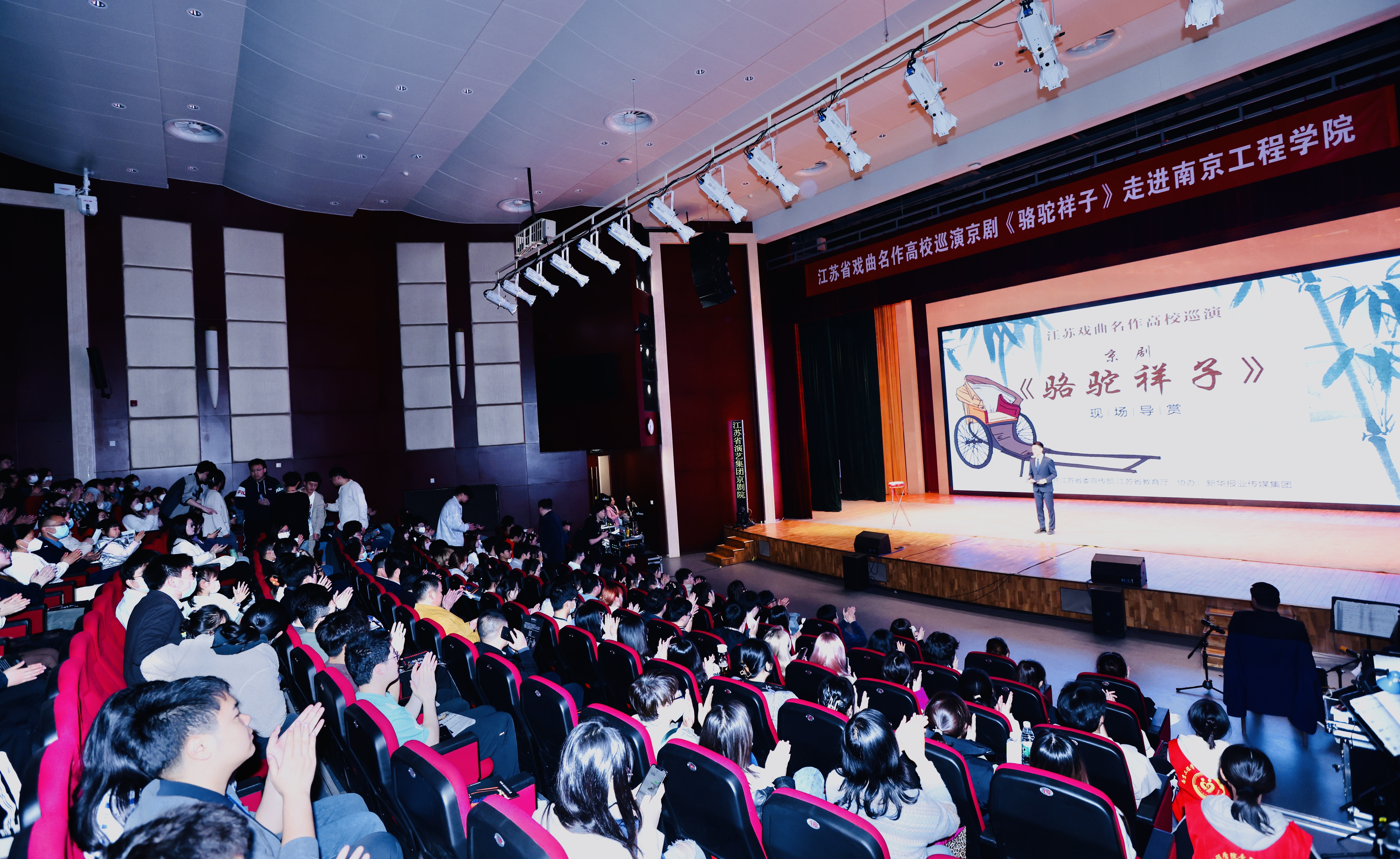 交汇点讯 当老舍先生的经典遇上国粹的韵味;当浸透历史深沉的戏曲文化,与朝气蓬勃的新时代青年“双向奔赴”,会擦出怎样的火花?3月9日晚,江苏省戏曲名作高校巡演走进beat365官方网站,江苏京剧扛鼎之作、传承版《骆驼祥子》在校科创园天印会议中心上演,吸引六百多名师生汇聚一堂。剧场里,排山倒海的喝彩紧跟着台上演员一次次精彩的动作、唱腔传来,在这个热烈的夜晚,每颗心都为经久不衰、历久弥新的传统京剧艺术而震撼,而感动……