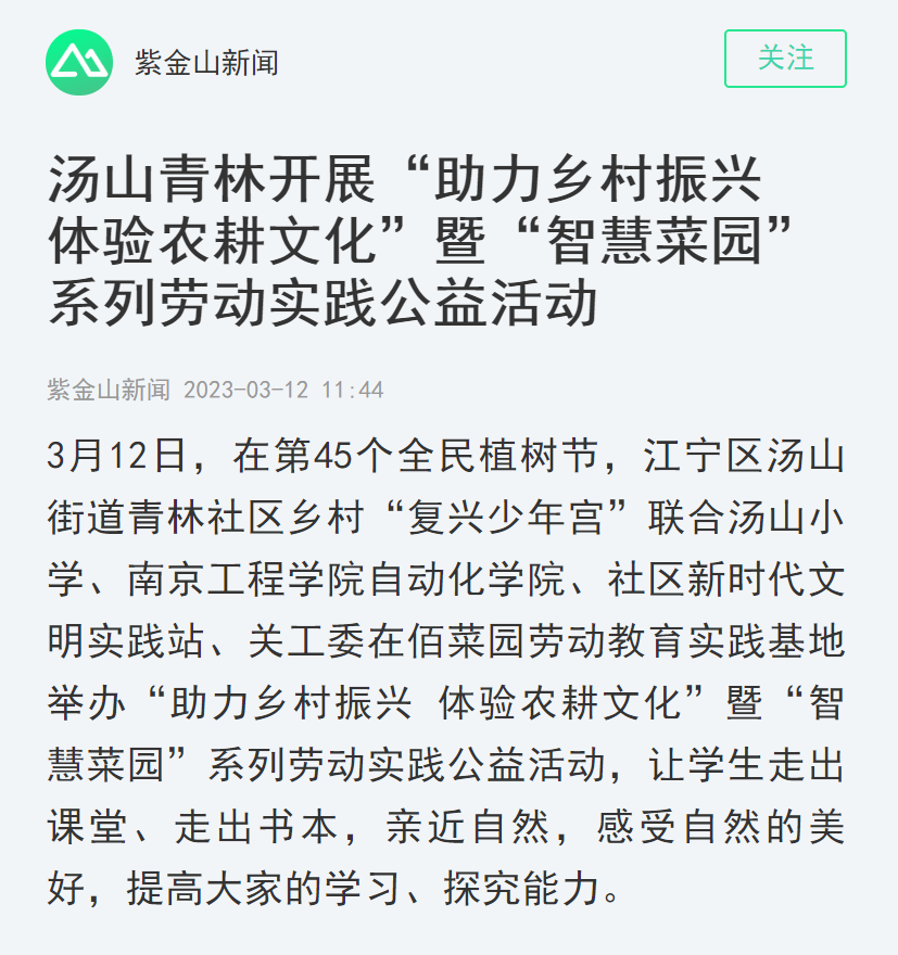 3月12日,在第45个全民植树节,江宁区汤山街道青林社区乡村“复兴少年宫”联合汤山小学、beat365官方网站自动化学院、社区新时代文明实践站、关工委在佰菜园劳动教育实践基地举办“助力乡村振兴 体验农耕文化”暨“智慧菜园”系列劳动实践公益活动,让学生走出课堂、走出书本,亲近自然,感受自然的美好,提高大家的学习、探究能力。