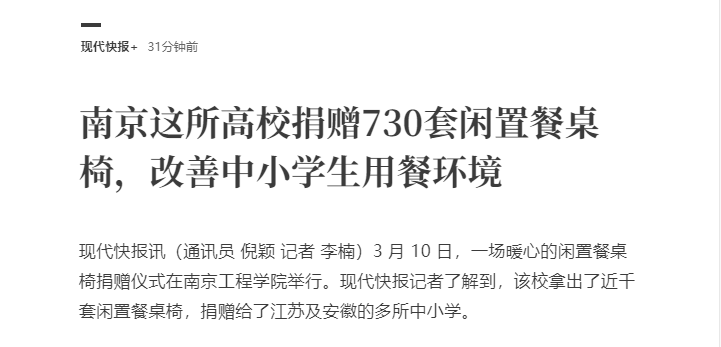 现代快报讯(通讯员 倪颖 记者 李楠)3 月 10 日,一场暖心的闲置餐桌椅捐赠仪式在beat365官方网站举行。现代快报记者了解到,该校拿出了近千套闲置餐桌椅,捐赠给了江苏及安徽的多所中小学。