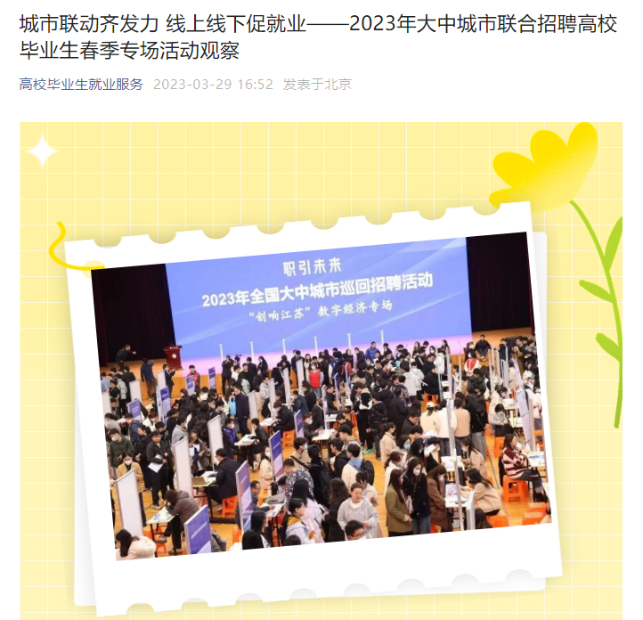 2023年大中城市联合招聘高校毕业生春季专场活动将首站选择在用工大省江苏,开设了数字经济、“筑梦江北”“才聚扬城”等专场供需对接活动,来自全国15个省份、36个大中城市的648家用人单位齐聚一堂,提供就业岗位近2万个,专业覆盖计算机科学技术、数据科学与大数据技术、数据通讯、人工智能等多领域,吸引省内外30多所高校的2万余名毕业生参与,现场达成就业意向2500余人。