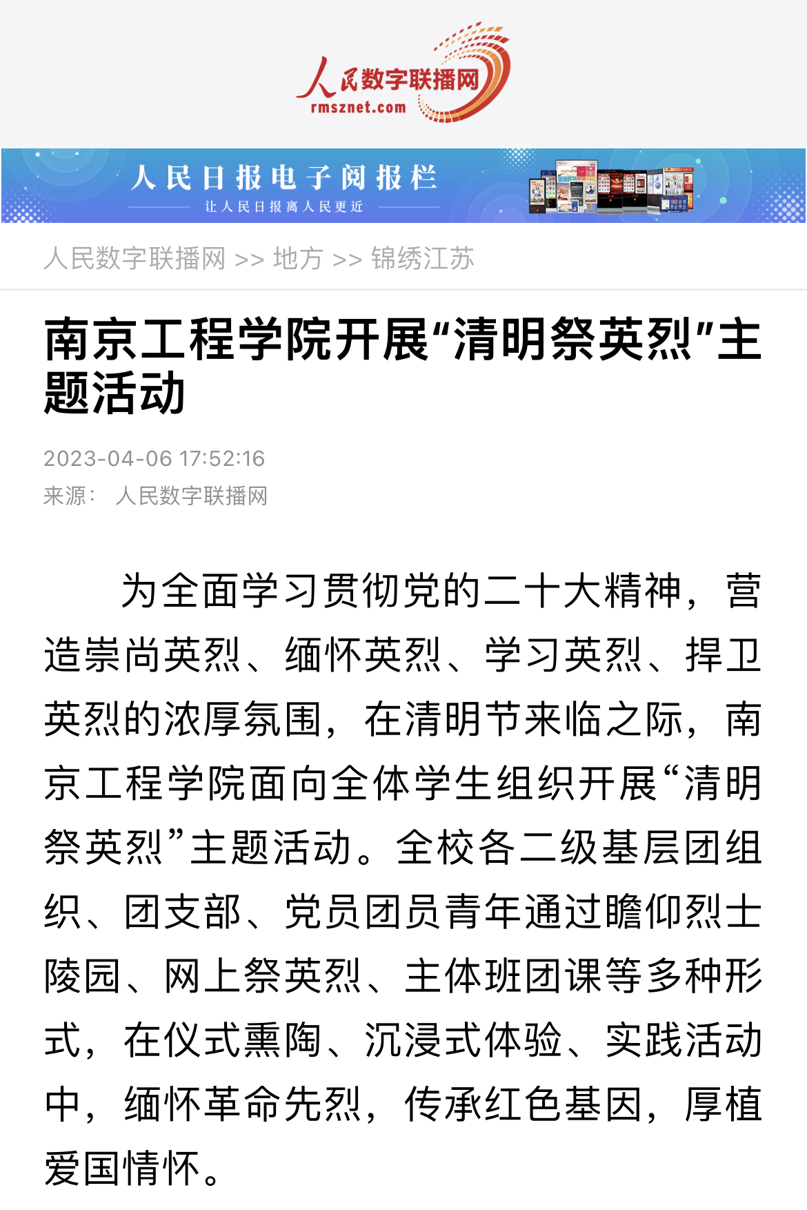 “我志愿加入中国共产主义青年团,坚决拥护中国共产党的领导……”清明前夕,电力工程学院、自动化学院、计算机工程学院、环境工程学院、国际教育学院、工业中心等组织团学骨干、青年学生前往雨花台烈士陵园,在英雄纪念碑前,向烈士们默哀、鞠躬,重温入团誓词,深情朗诵《雨花英雄赞歌》,追思革命英烈的伟大精神;机械工程学院、材料科学与工程学院、经济与管理学院、外国语学院分别组织学生前往南京方山烈士公墓、侵华日军南京大屠杀遇难同胞纪念馆、瞿秋白同志纪念馆、南京抗日航空烈士纪念馆等地,了解先烈事迹,接受党性教育。