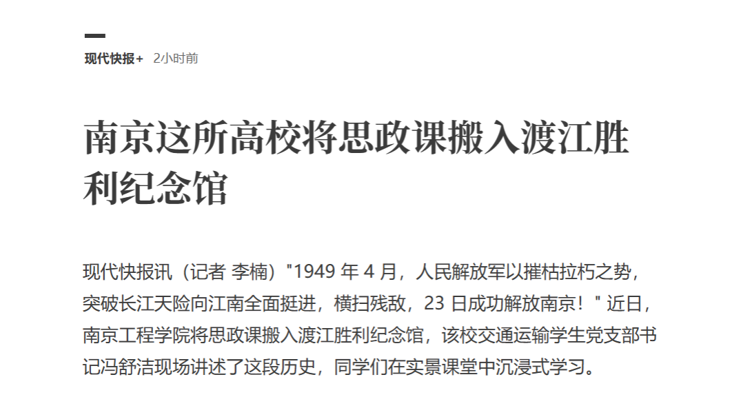 现代快报讯(记者 李楠)“1949 年 4 月,人民解放军以摧枯拉朽之势,突破长江天险向江南全面挺进,横扫残敌,23 日成功解放南京!”近日,beat365官方网站将思政课搬入渡江胜利纪念馆,该校交通运输学生党支部书记冯舒洁现场讲述了这段历史,同学们在实景课堂中沉浸式学习。