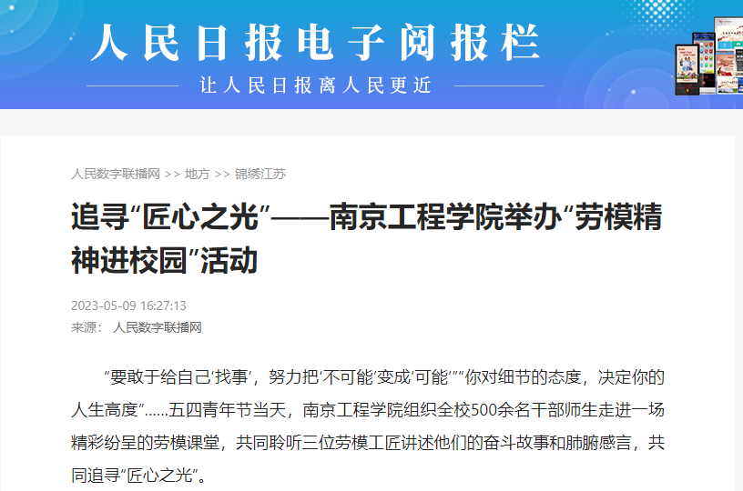 “全国五一劳动奖章”获得者、大国工匠年度人物、中国电子科技集团公司第十四研究所数控车高级技师胡胜,“全国五一劳动奖章”获得者、南京东华汽车实业有限公司副总监、南京法雷奥离合器有限公司副总经理岳鹏祥,“全国五一劳动奖章”获得者、中国电力行业技术能手、国网南通供电公司设备管理部主任胡新雨应邀作为主讲,他们用朴实的语言、动人的案例,与现场师生分享了自己在平凡岗位上执着专注、攻坚克难的感人事迹和成长经历,赢得了现场阵阵掌声。