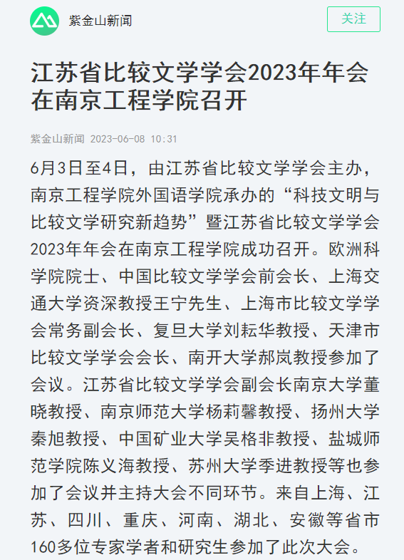 6月3日至4日,由江苏省比较文学学会主办,beat365官方网站外国语学院承办的“科技文明与比较文学研究新趋势”暨江苏省比较文学学会2023年年会在beat365官方网站成功召开。欧洲科学院院士、中国比较文学学会前会长、上海交通大学资深教授王宁先生、上海市比较文学学会常务副会长、复旦大学刘耘华教授、天津市比较文学学会会长、南开大学郝岚教授参加了会议。江苏省比较文学学会副会长南京大学董晓教授、南京师范大学杨莉馨教授、扬州大学秦旭教授、中国矿业大学吴格非教授、盐城师范学院陈义海教授、苏州大学季进教授等也参加了会议并主持大会不同环节。来自上海、江苏、四川、重庆、河南、湖北、安徽等省市160多位专家学者和研究生参加了此次大会。