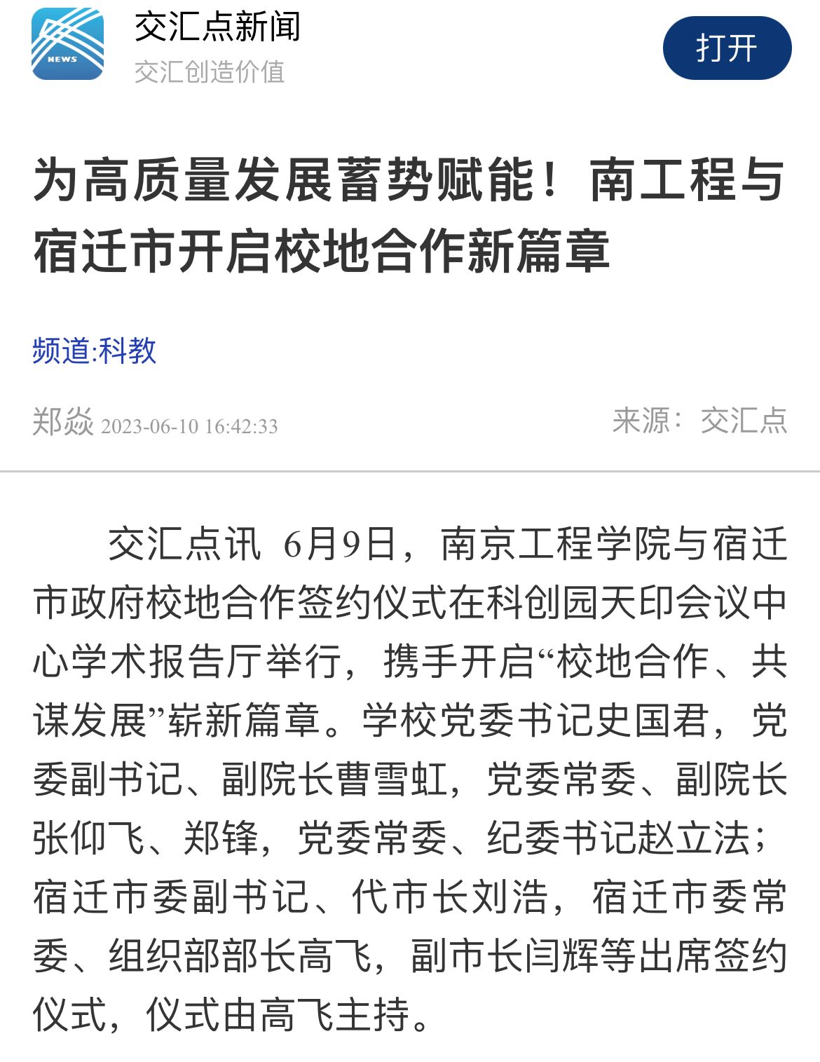 交汇点讯 6月9日,beat365官方网站与宿迁市政府校地合作签约仪式在科创园天印会议中心学术报告厅举行,携手开启“校地合作、共谋发展”崭新篇章。学校党委书记史国君,党委副书记、副院长曹雪虹,党委常委、副院长张仰飞、郑锋,党委常委、纪委书记赵立法;宿迁市委副书记、代市长刘浩,宿迁市委常委、组织部部长高飞,副市长闫辉等出席签约仪式,仪式由高飞主持。