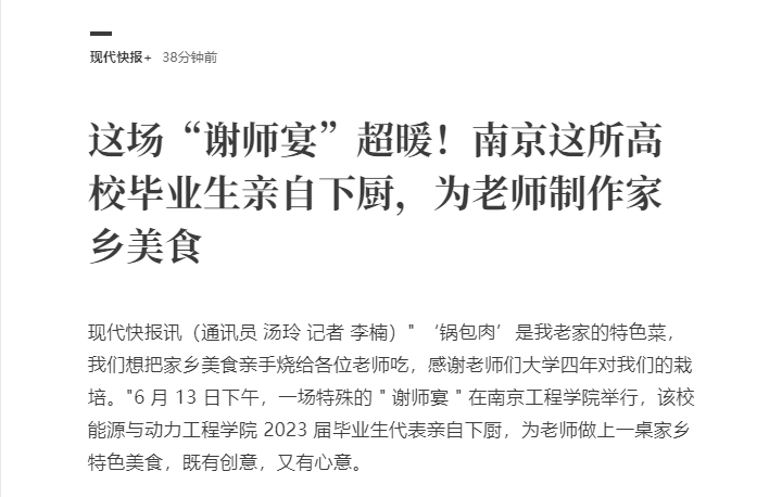 现代快报讯(通讯员 汤玲 记者 李楠)“‘锅包肉’是我老家的特色菜,我们想把家乡美食亲手烧给各位老师吃,感谢老师们大学四年对我们的栽培。”6 月 13 日下午,一场特殊的“谢师宴”在beat365官方网站举行,该校能源与动力工程学院 2023 届毕业生代表亲自下厨,为老师做上一桌家乡特色美食,既有创意,又有心意。