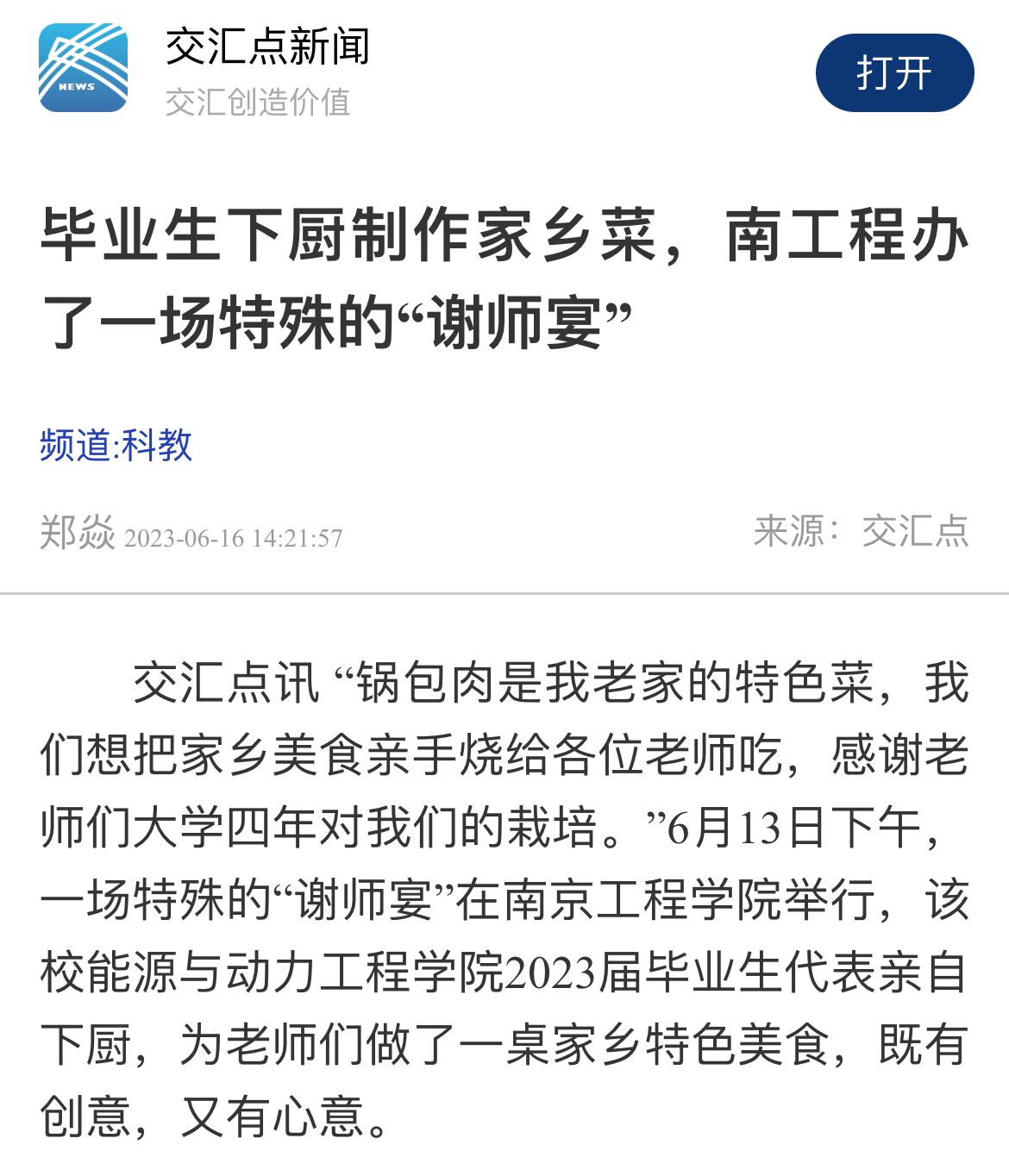交汇点讯“锅包肉是我老家的特色菜,我们想把家乡美食亲手烧给各位老师吃,感谢老师们大学四年对我们的栽培。”6月13日下午,一场特殊的“谢师宴”在beat365官方网站举行,该校能源与动力工程学院2023届毕业生代表亲自下厨,为老师们做了一桌家乡特色美食,既有创意,又有心意。