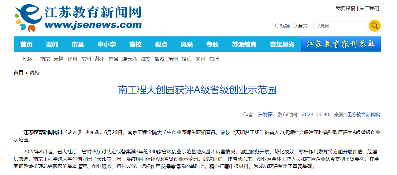 该校大学生创业园“天印梦工场”自2018年获评省级大学生创业示范园以来,创业孵化成效突出,新增企业119家,累计孵化企业突破200家,获批国家高新技术企业9家,省科技型中小企业等72家。绩效评价勇创佳绩,连续5年获评市级众创空间绩效评价优秀等次,累计获政府各级各类奖补577.3万元。平台建设再立新功,获批全国创业孵化示范基地,新增省级平台3个。创业典型持续涌现,新增全国大学生创业英雄百强4人,十强1人。样板效应示范引领,接待了中央等各级政府部门、兄弟院校参观调研144次,获各类媒体报道68次,获评“2020 年江宁区创新发展突出贡献集体”。
