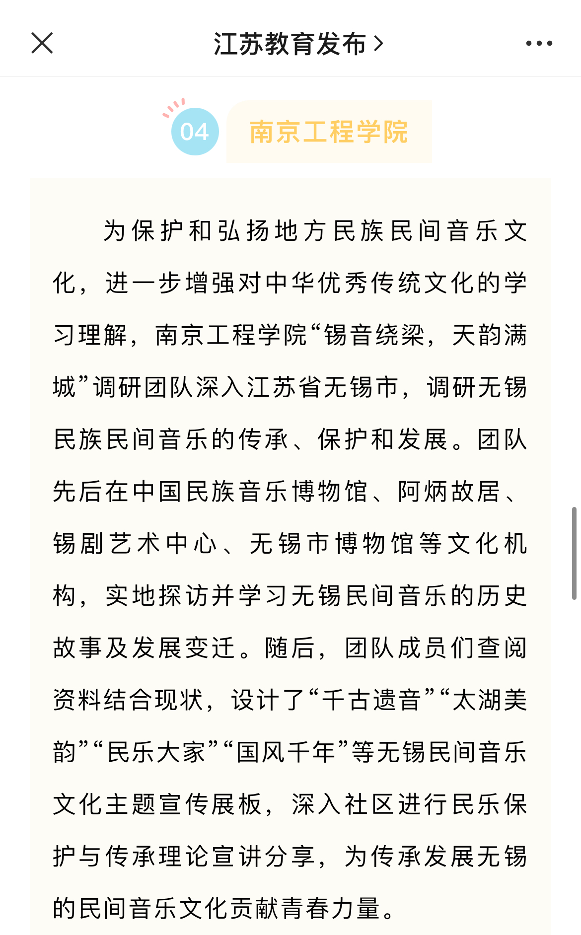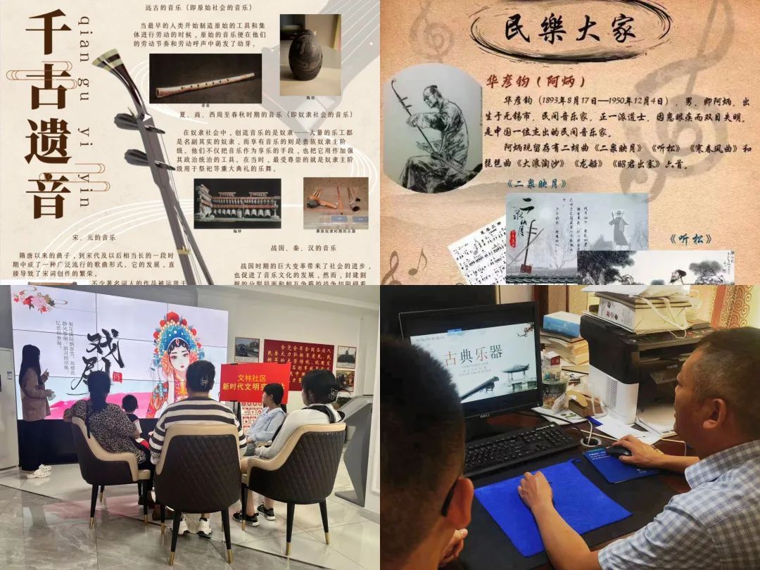 为保护和弘扬地方民族民间音乐文化,进一步增强对中华优秀传统文化的学习理解,beat365官方网站“锡音绕梁,天韵满城”调研团队深入江苏省无锡市,调研无锡民族民间音乐的传承、保护和发展。团队先后在中国民族音乐博物馆、阿炳故居、锡剧艺术中心、无锡市博物馆等文化机构,实地探访并学习无锡民间音乐的历史故事及发展变迁。随后,团队成员们查阅资料结合现状,设计了“千古遗音”“太湖美韵”“民乐大家”“国风千年”等无锡民间音乐文化主题宣传展板,深入社区进行民乐保护与传承理论宣讲分享,为传承发展无锡的民间音乐文化贡献青春力量。